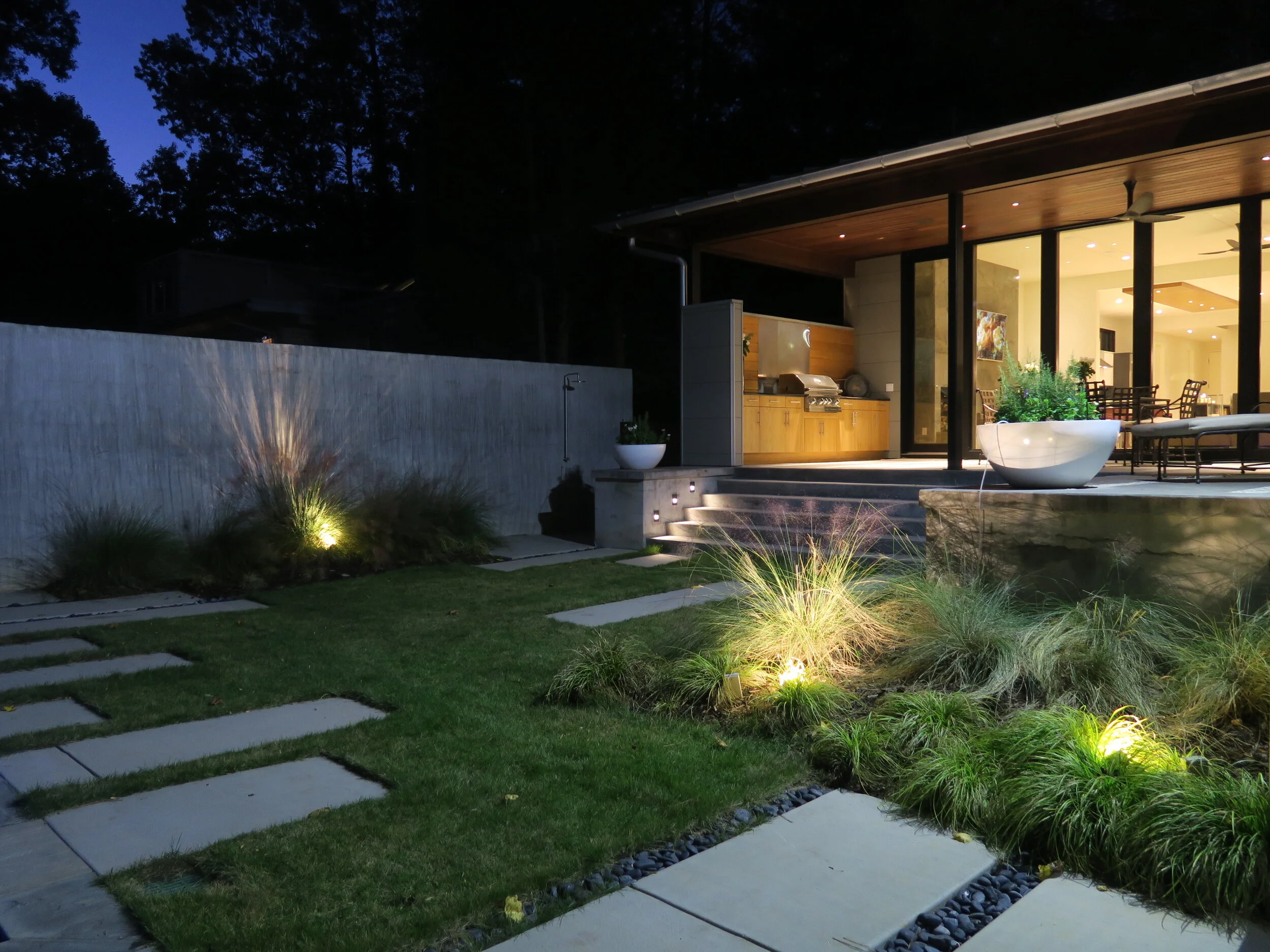 The Story…Contemporary retreat: This project was completed in conjunction with the homeowner, who was also the architect of the residence. The landscape design consists of a random series of large concrete slabs that help identify pathways and outdoor patio space. Native and adaptive ornamental grasses were utilized to create a sense of movement throughout the spaces.
